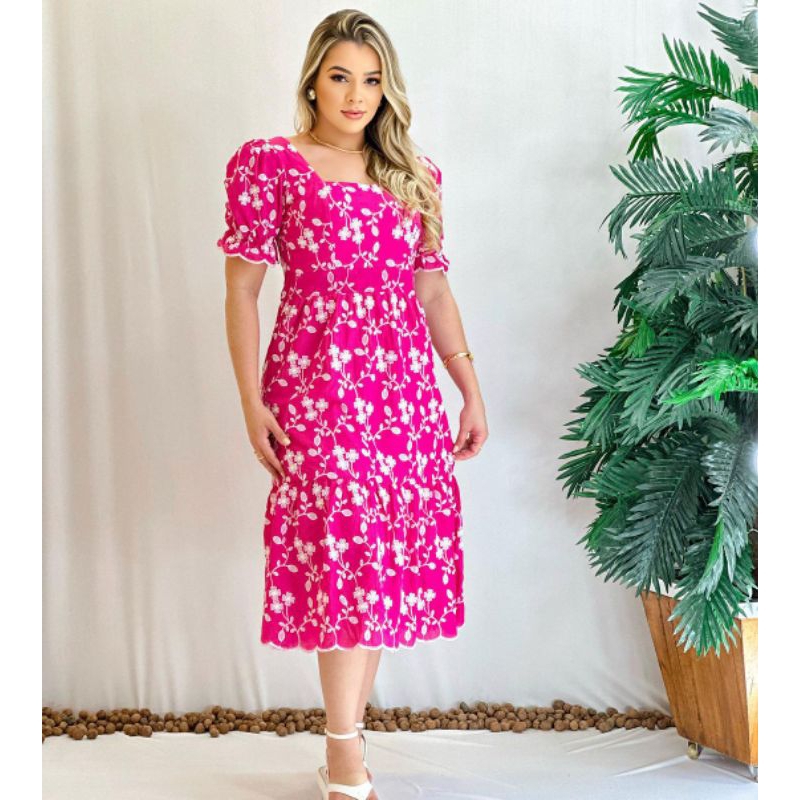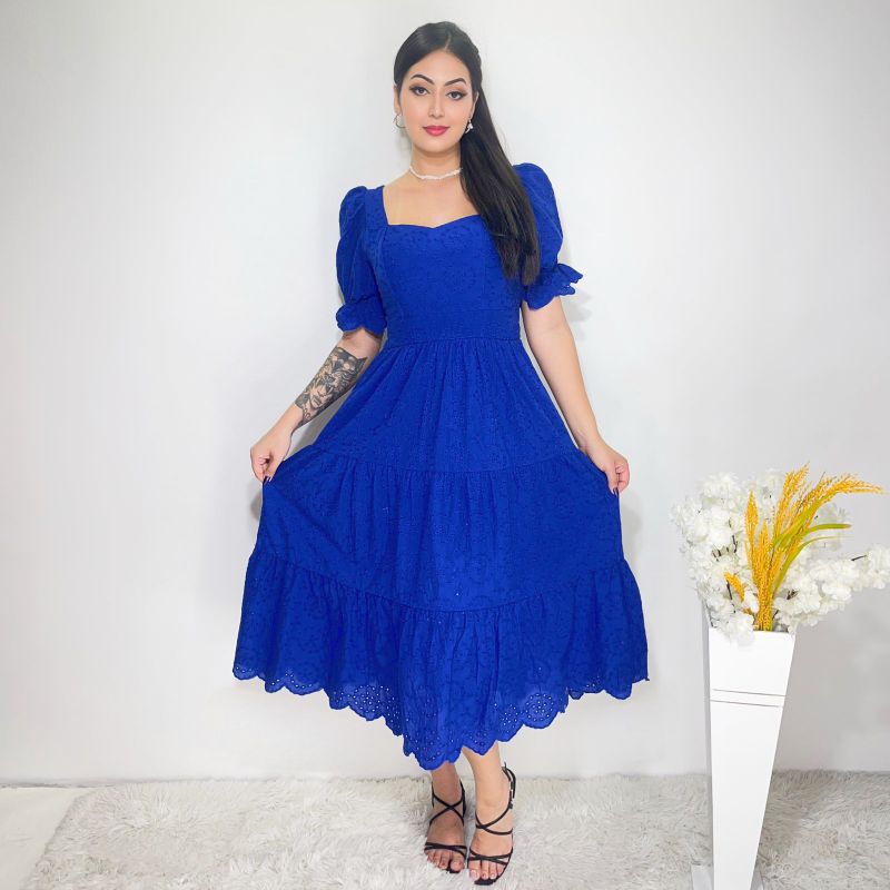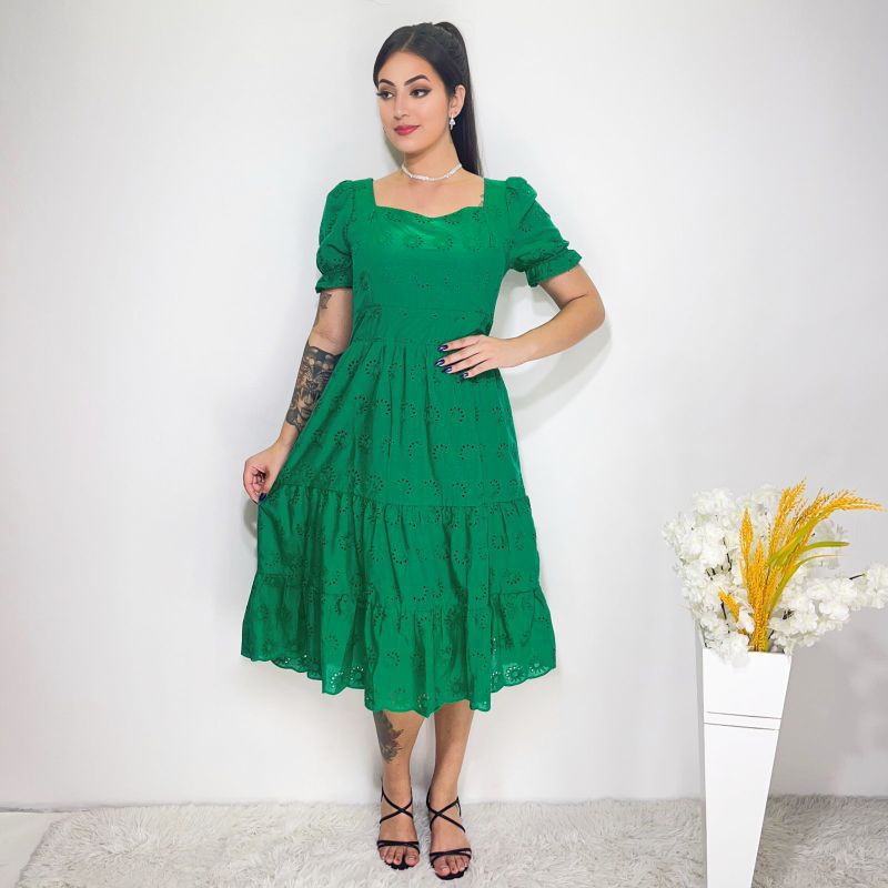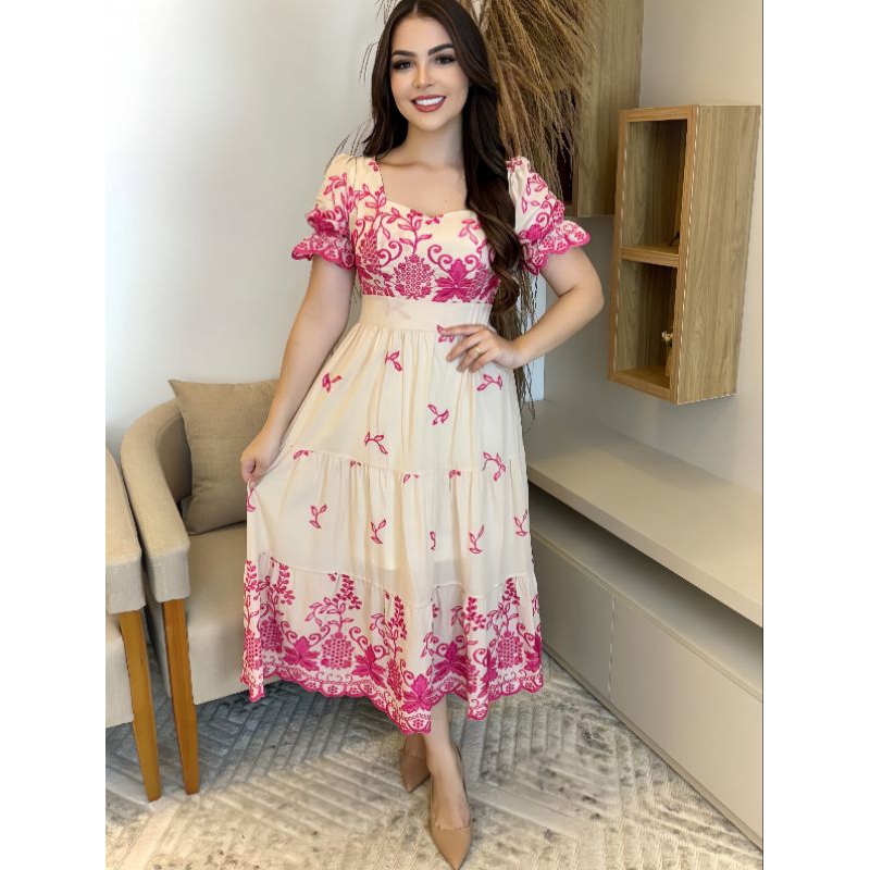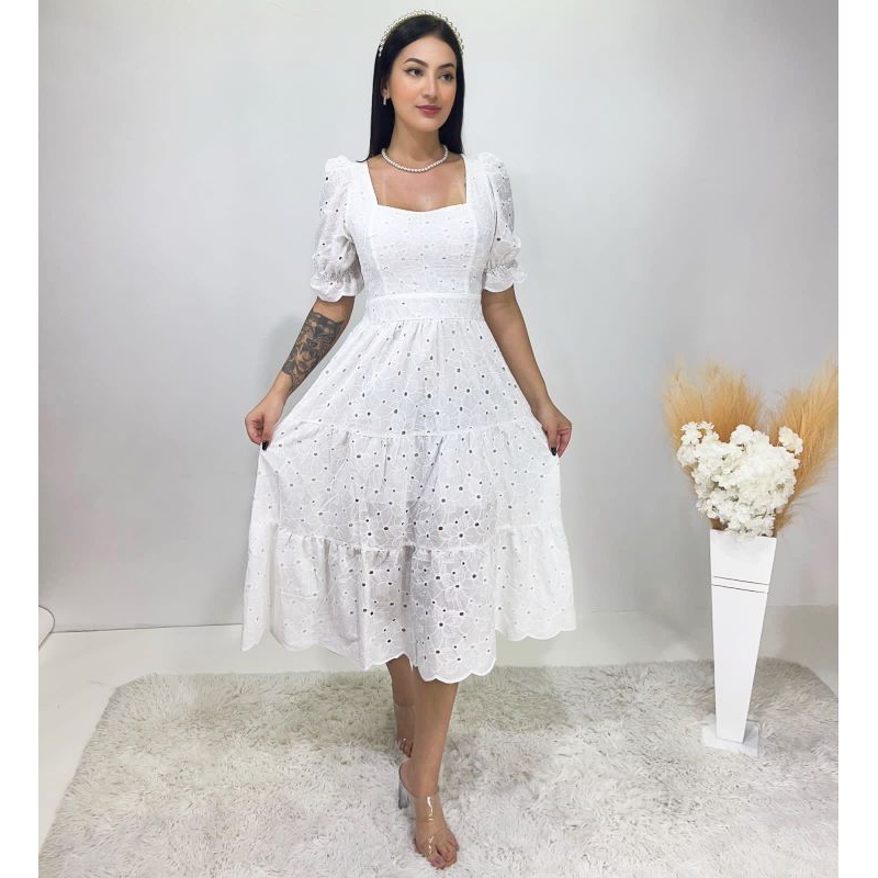 Vestido midi luxo lese bordado algodão manga curto 0490