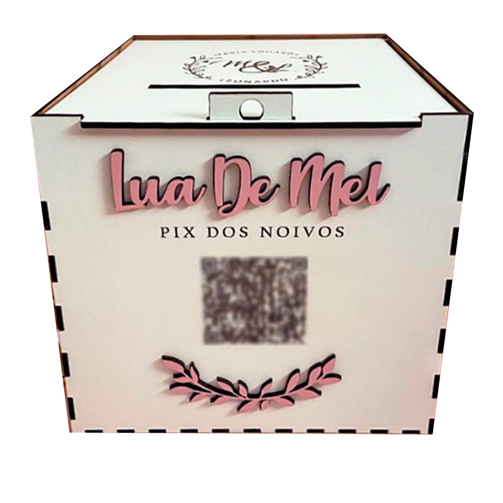 Caixa para Casamento Lua de Mel Personalizada com Nomes e Bolsa para QR Code - MDF Branco 20x20cm