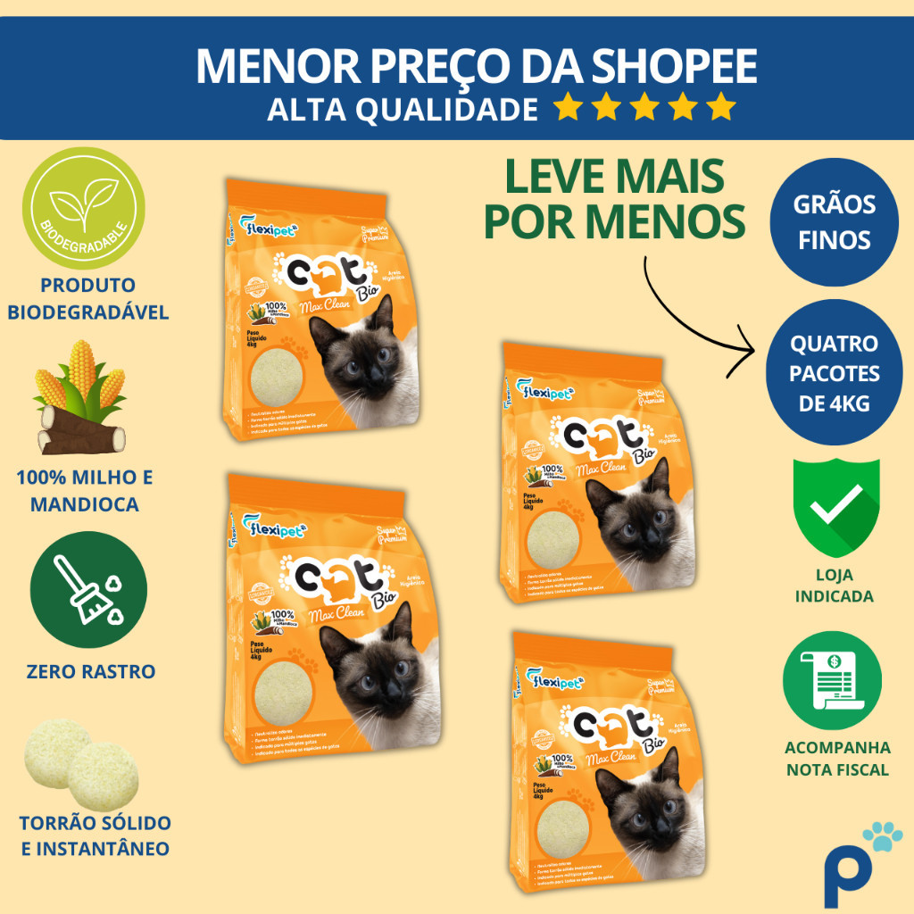 Areia Higiênica Biodegradável Catbio 16 Kg (4 pacotes de 4 kg) - Max Clean - Grãos Finos - Miaucat