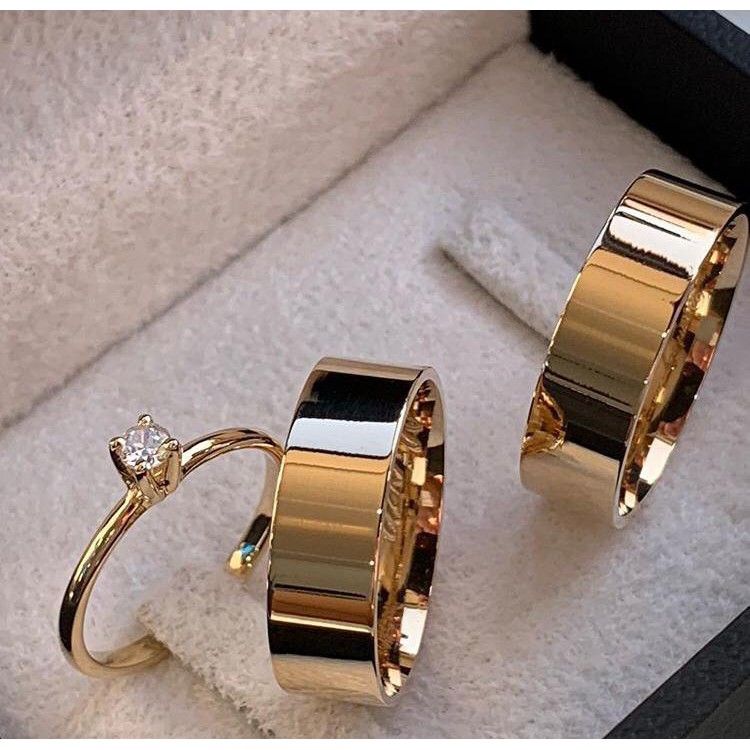 Par Aliança Reta 6mm mais 1 Anel Solitário de Aço Inoxidável Dourado