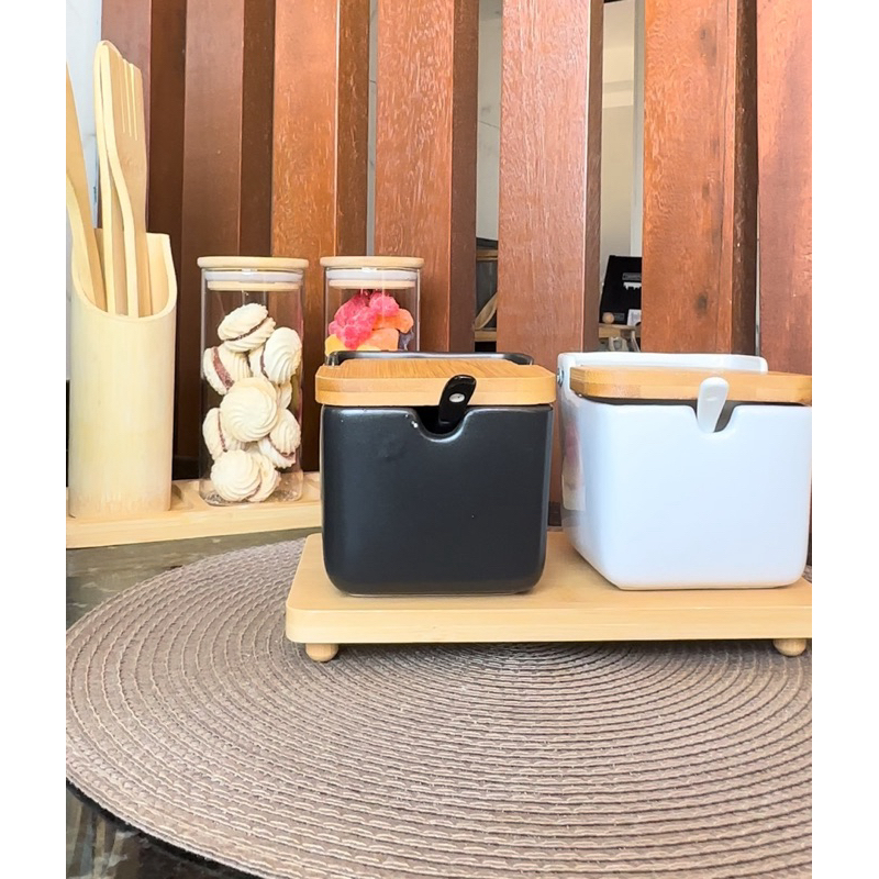 Saleiro Açucareiro Porta Sal Saleira de Mesa Cerâmica com Tampa de Bambu e Colher Decorativo