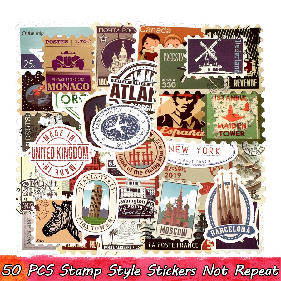 50 Autocolantes De Carimbo PCS Retro Stamp Sticker Viagem Histórico De Construção De Carimbos Postais Para Bagagem De Bricolage Mala De Laptop Guitarra Frigorífico