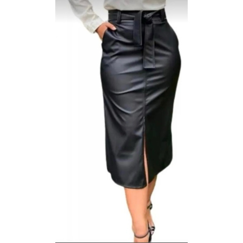 Saia Midi Courino Feminina Cintura Alta Preta Evangélica com Zíper, Cinto e Fenda Couro Ecológico Sintético Coro Fake Corino