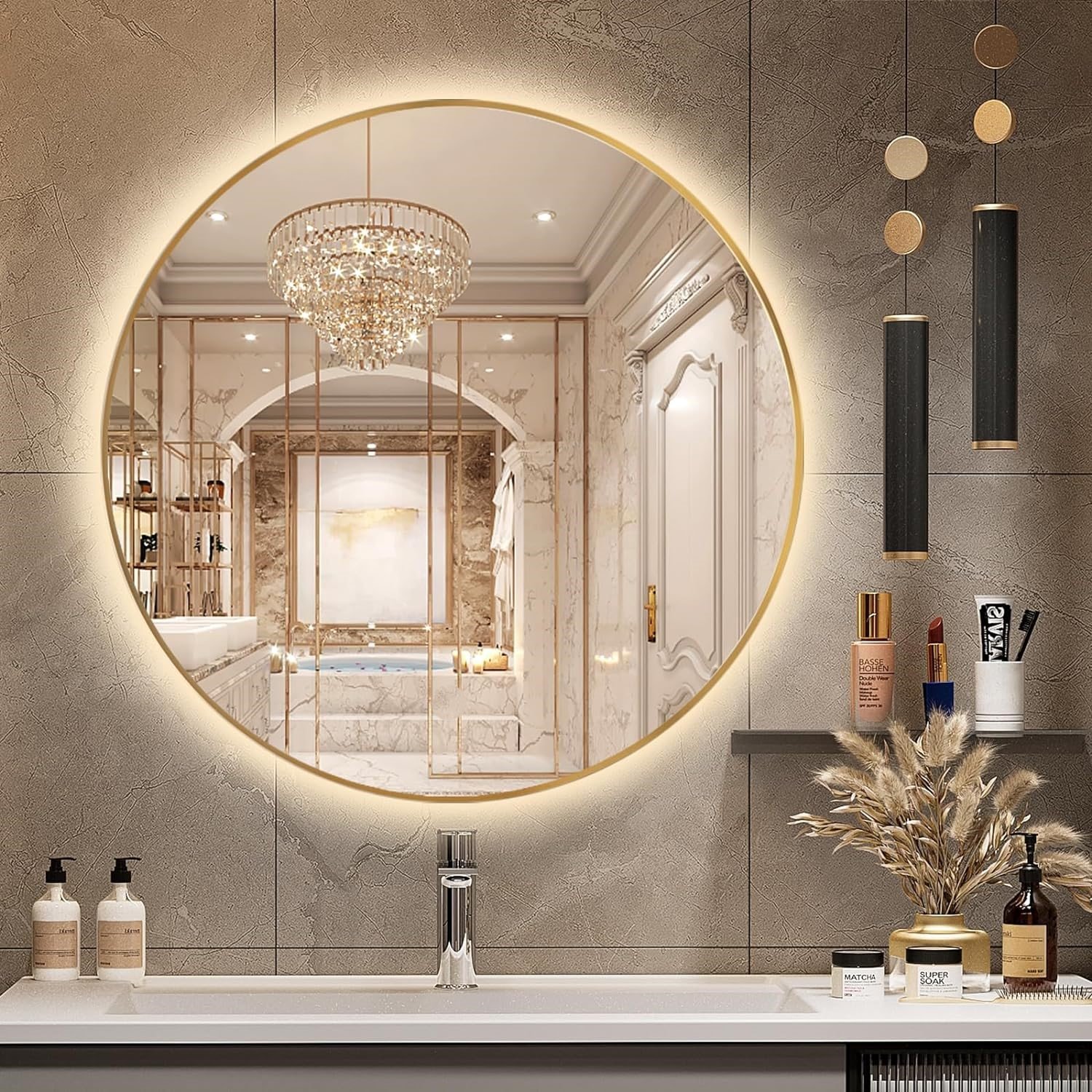 Espelho Redondo com Moldura Dourada Iluminado com Led Quente 70cm
