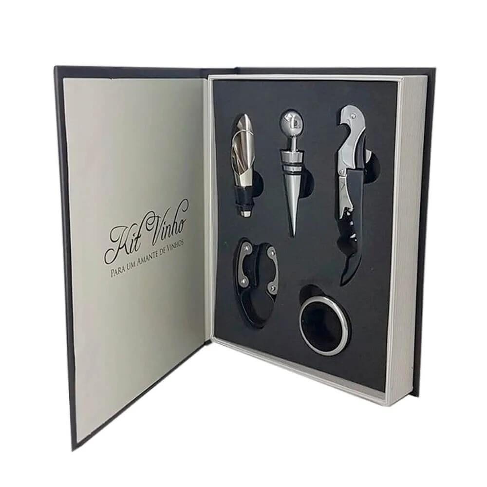 Kit Vinho com Abridor Saca Rolhas Tampa Dosador Corta Lacre Livro 5 Acessorios