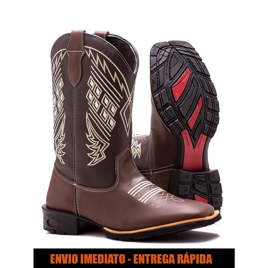 Bota Masculina Texana Em Couro Legitimo Cano Alto Bordado Country Bico Fino