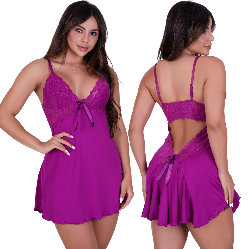 Camisola + Calcinha Microfibra Sexy Detalhe de Renda Luxo Sem Bojo Baby Doll Lingerie Pijama Feminino