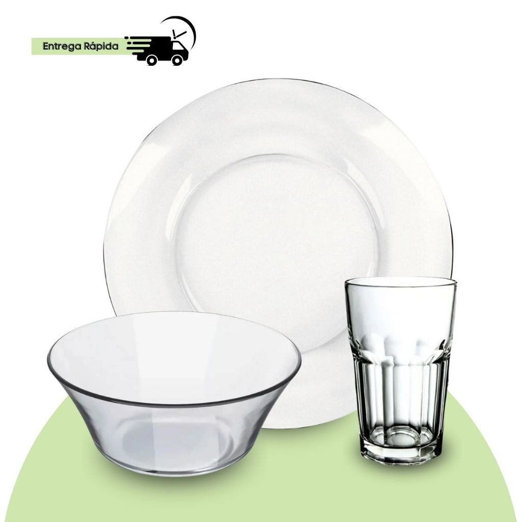 Jogo De Pratos Fundos E Copos C/30 Peças Aparelho de Jantar Em Vidro Com Talheres