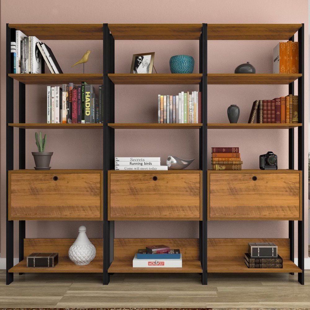 Conjunto Estantes para Livros Match 3 Portas Basculantes 9 Prateleiras Pinho/Preto - Pnr Móveis