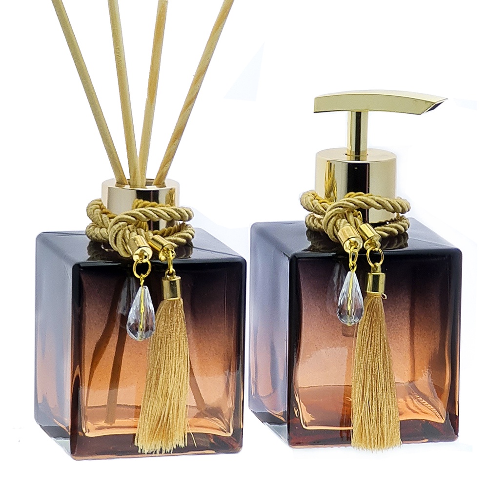Kit Banheiro Porta Sabonete Líquido e Difusor de Essência Aromatizante Dourado Luxo