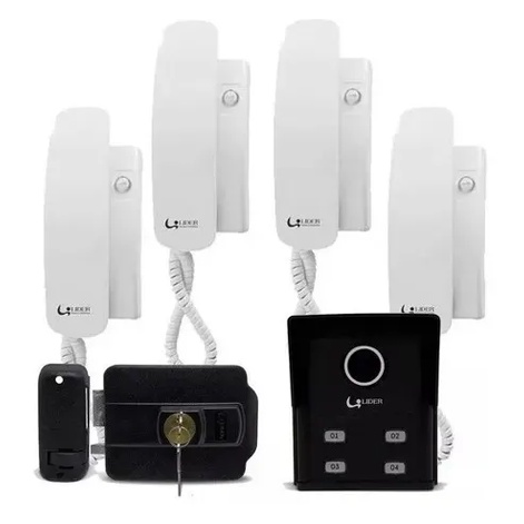 Kit Porteiro Eletrônico Coletivo Interfone 4 Pontos + fechadura elétrica + 4 Monofones