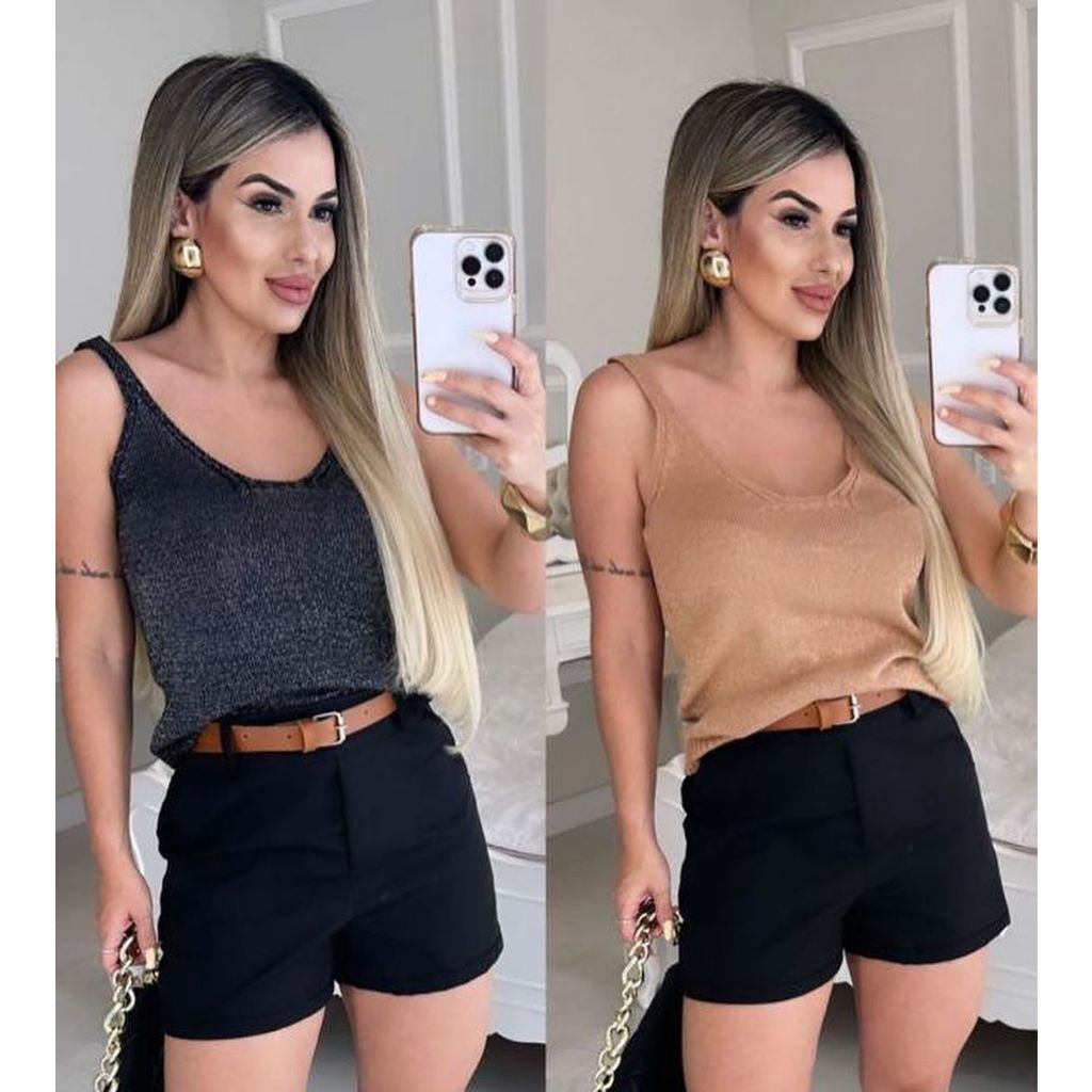 Blusa Regata Lurex com Brilho Feminina Básica Sem Manga Lançamento Natal Réveillon Ano Novo