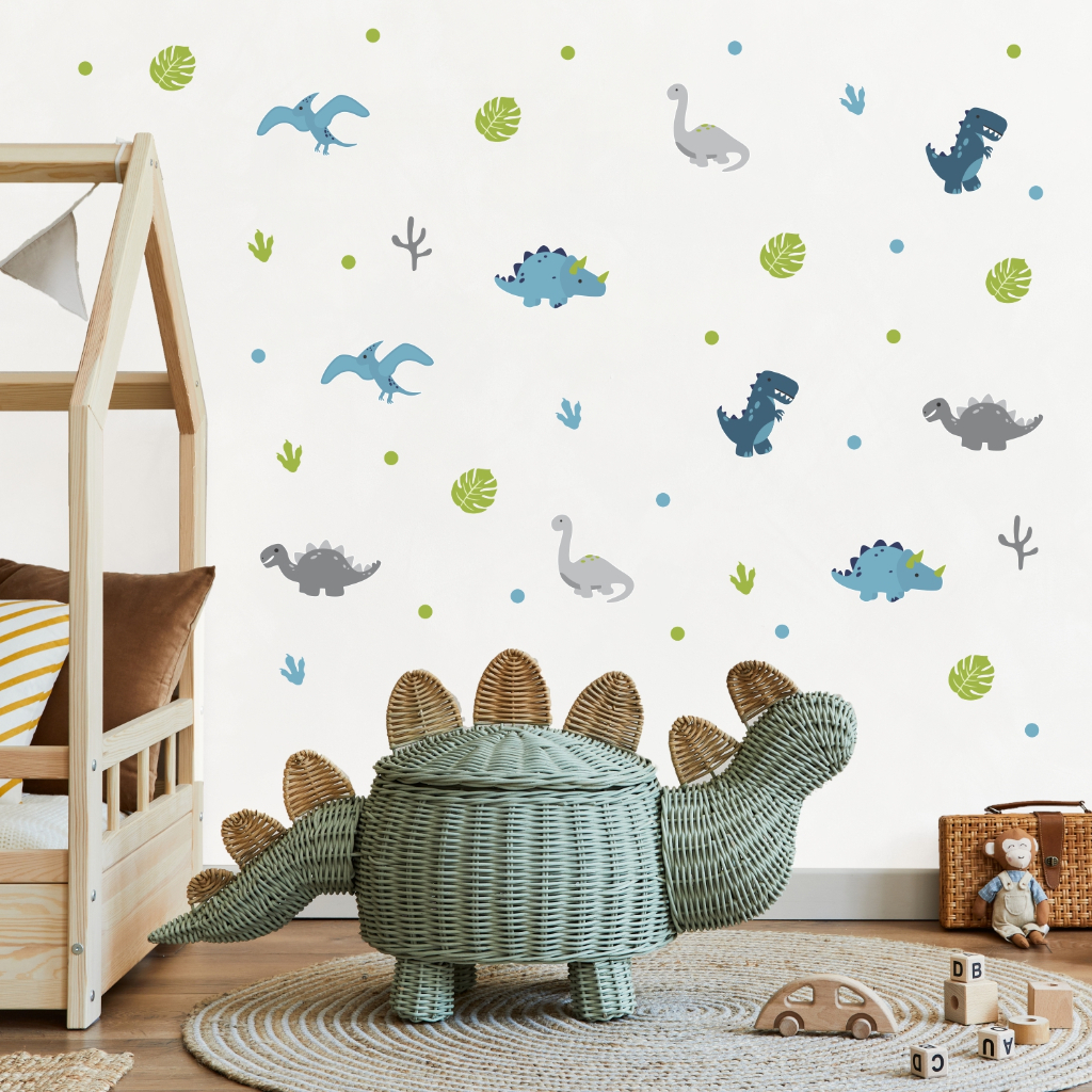 Adesivo Parede Infantil Dinossauros Dinos Baby com folhas e bolinhas decoração quarto de bebê