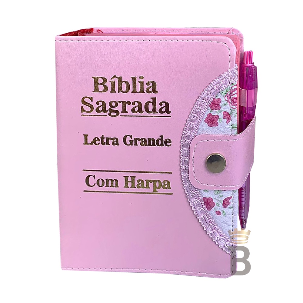 Bíblia Sagrada Letra Grande - Rosa - Botão e Caneta Revista e Corrigida C/ Harpa