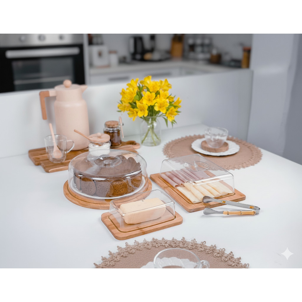 Kit Café da Manhã Bambu 3 Itens - Boleira | Porta Frios | Manteigueira Ideal Cantinho do Café e Mesa Posta