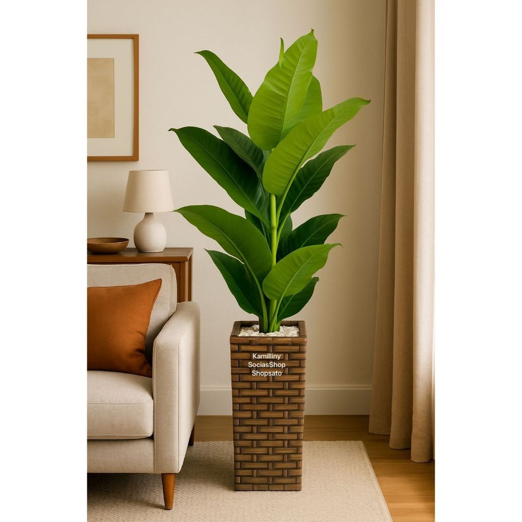 Arranjo Decorativo com Árvore de Bananeira Artificial 15 Folhas - Vaso Coluna P de Madeira + Pedras Brancas Enfeite