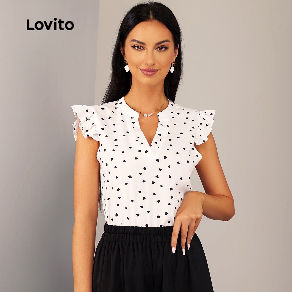 (Item Essencial) Lovito Blusa De Gola V Elegante Manga Babado Com Manga De Boca De Coração