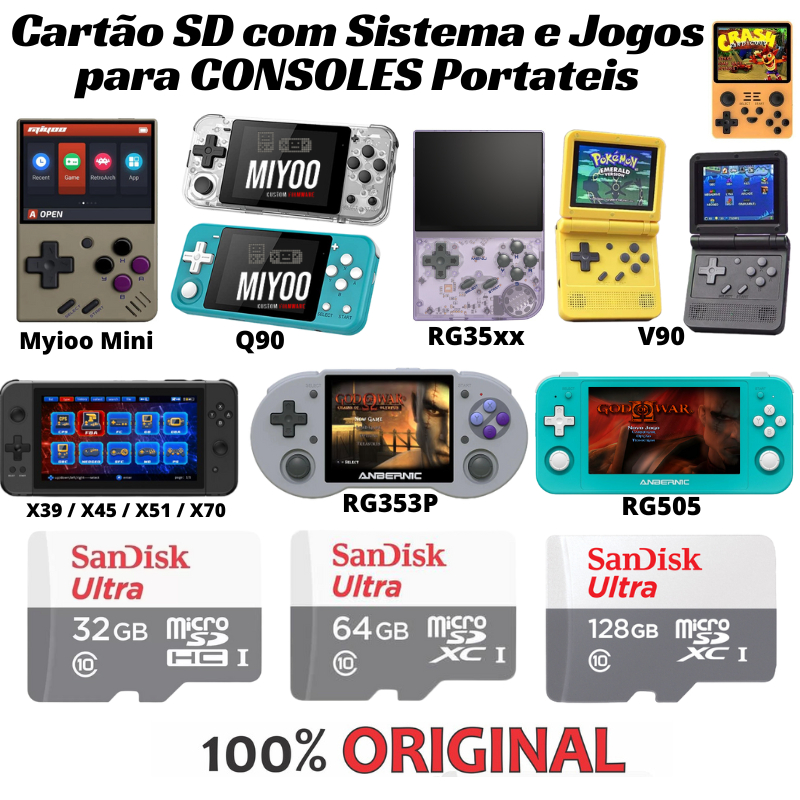 Cartão de Memória micro SD Classe 10 Original SanDisk para Consoles Portateis com Sistema Atualizado e com Jogos em Português PT-BR BUCKUP Miyoo Powkiddy e Anbernic Q90 / V90 / X18s / X28 / X39 / X45 / X51 / X55 / X70 RGB20s RG35xx RG351p RG353p RG505