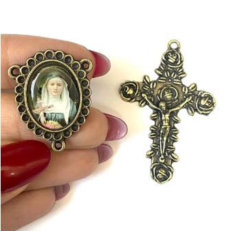 10 Crucifixos para Terços + Entremeios Resinados com foto de Santos - Kit para Terços Nossa Senhora Aparecida - Sagrada Familia - Padrio Pio - Santa Luzia - Nossa Senhora das Dores
