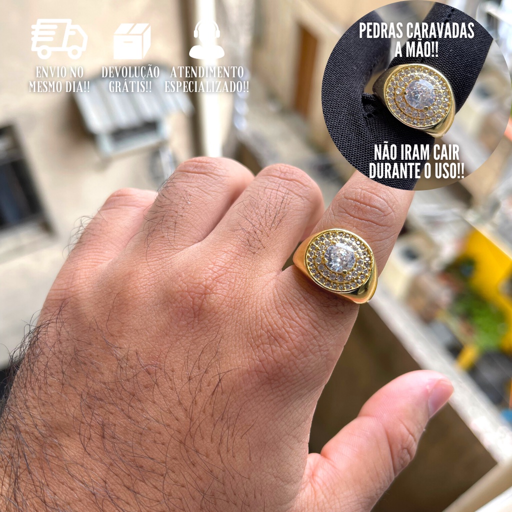 Anel Masculino De Ouro C/ Pedras Brilhantes Banhado a Ouro 24k Dedeira Cravejada Pedras Brancas