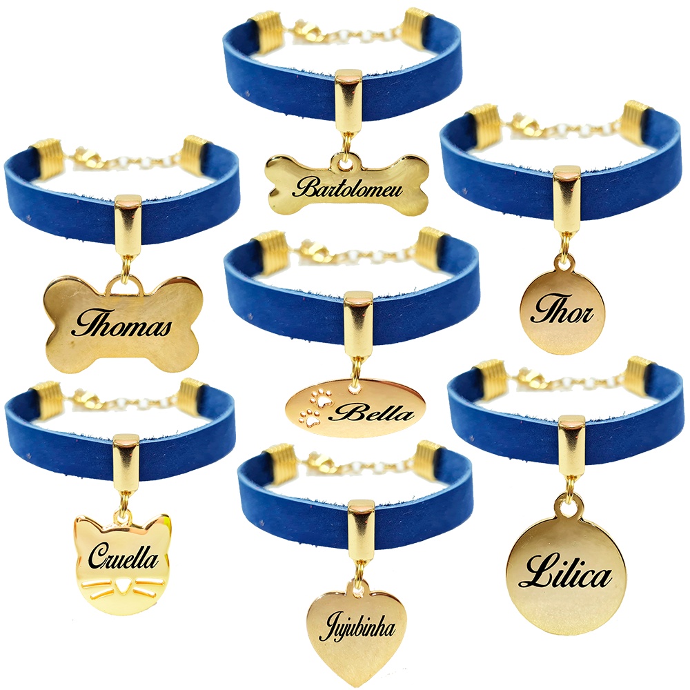 Coleira Couro Gargantilha Placa Nome Telefone Gravado Laser Gato Cachorro Plaquinha de Identificação Nobuck Azul