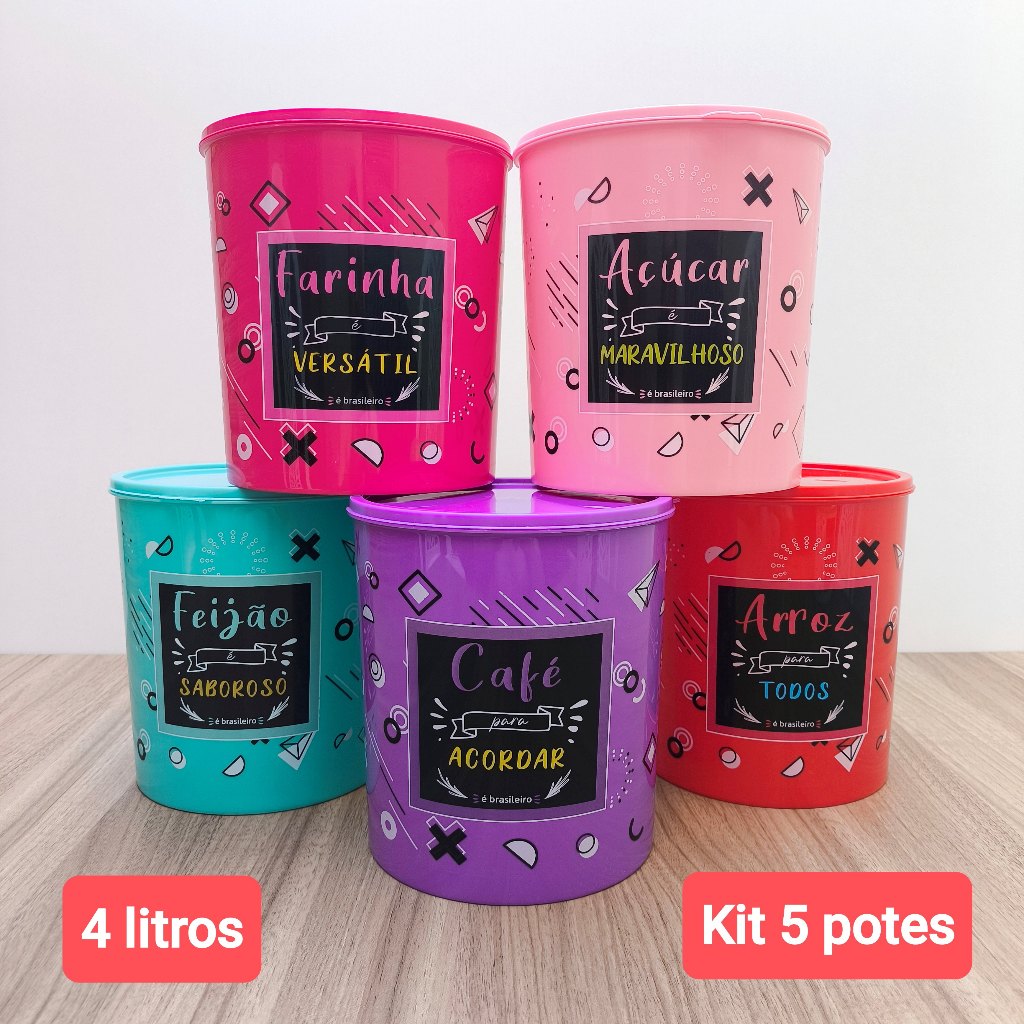 Kit 5 Potes Porta Mantimentos Grandes, Coloridos e Decorados 4 litros