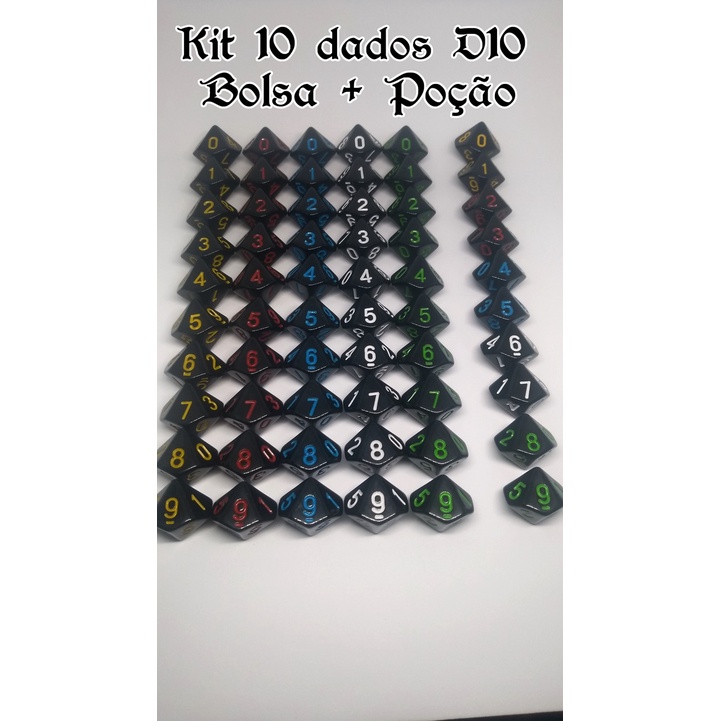 Conjunto 10 dados formato D10 para RPG + Poção + Bolsa - D&D Vampiro Lobisomem Tagmar Storyteller Dice set