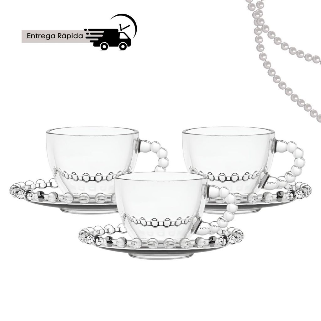 Jogo De Xícaras E Pires Em Vidro Transparente 6 Peças Para Chá Café 220ml Pearl Pérola Bolinha