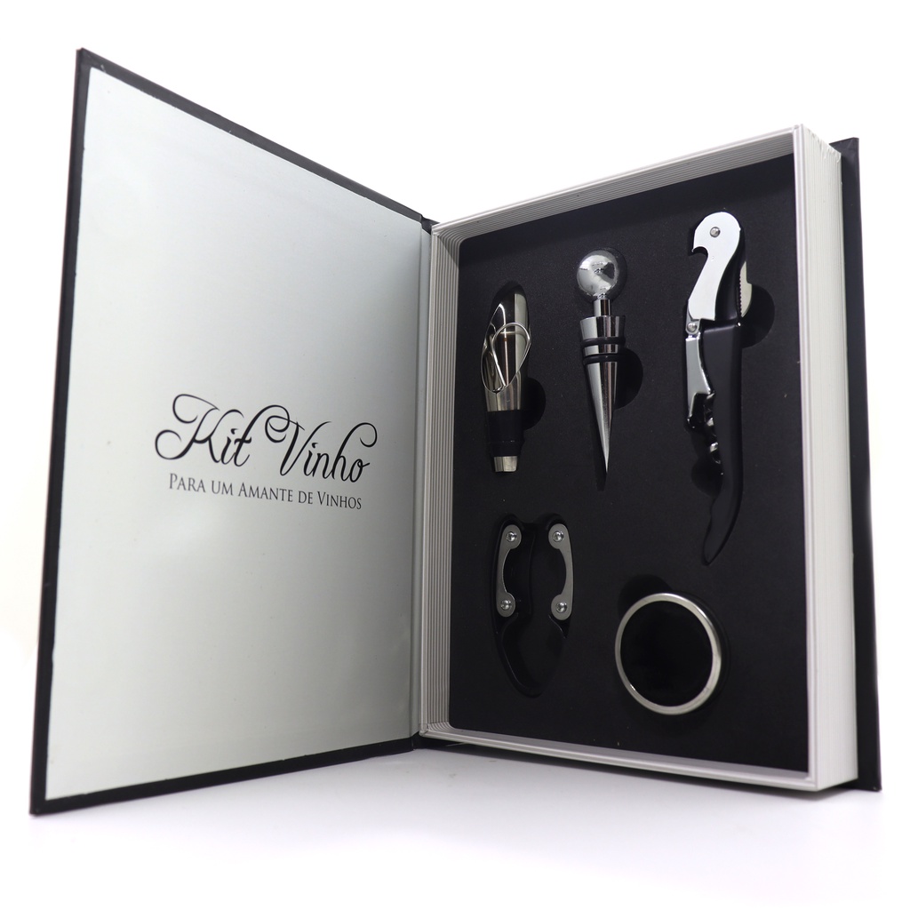 Kit Vinho Abridor Saca Rolhas Tampa Dosador Livro 05 Peças de Luxo