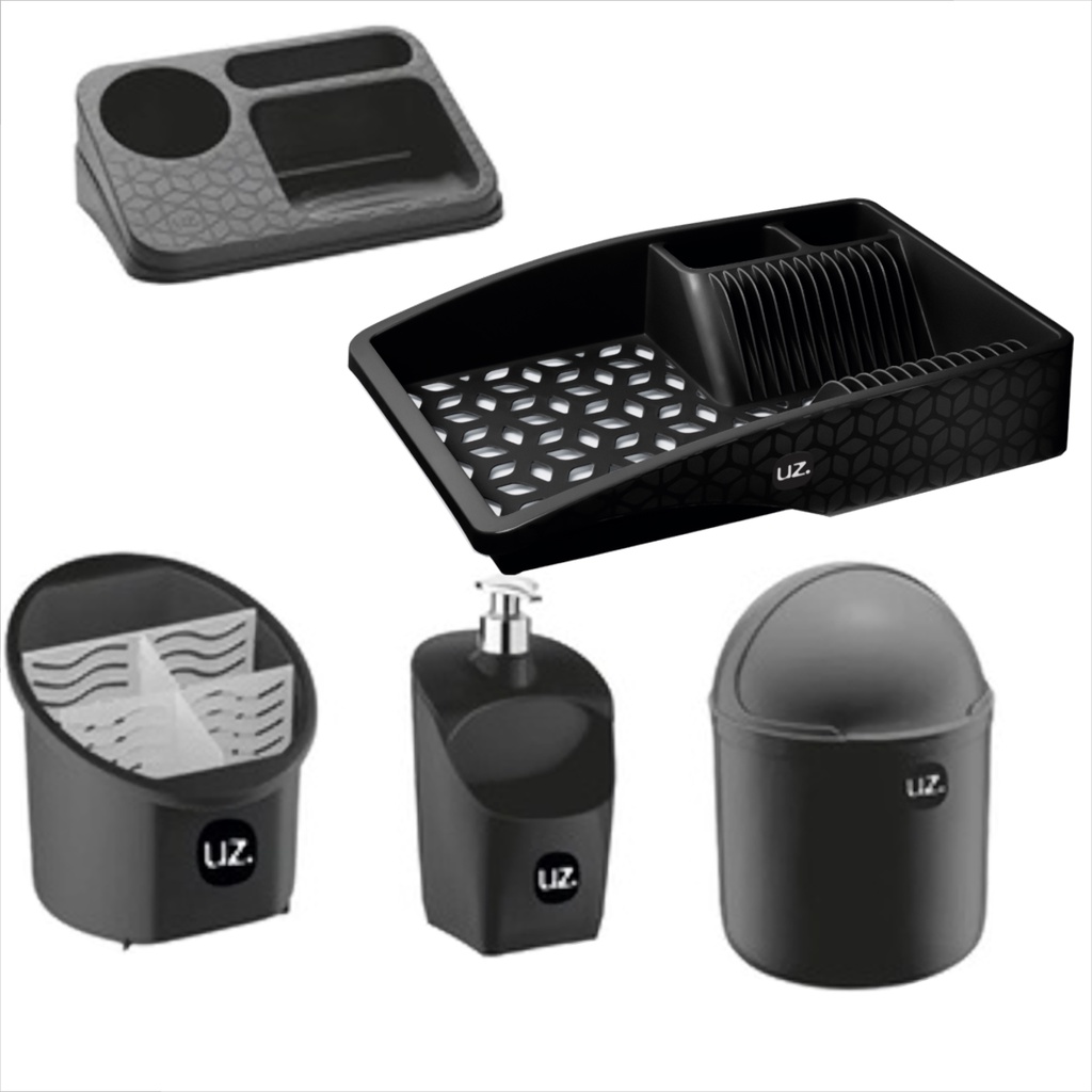 Kit Pia de Cozinha Preto Uz Lixeira 4L | Porta Detergente | Escorredor | Escorredor de Talheres | Organizador de Pia