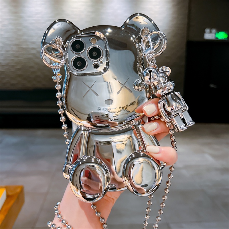 Capa De Urso 3D Luxuoso Para IPhone 13 Pro Max 14 Plus 11 Transversal Prata Metal Corrente 11 12 Com Pingente