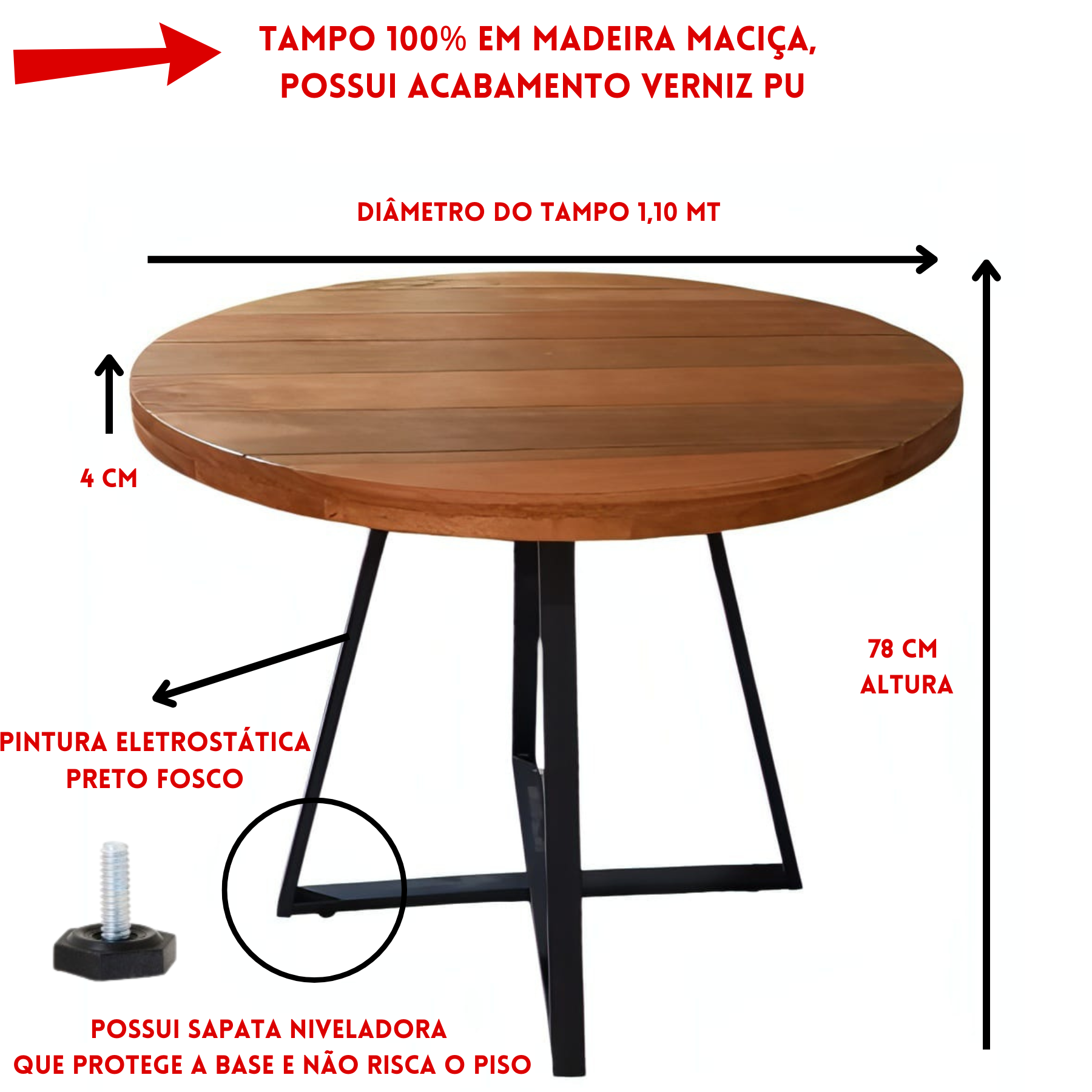 Mesa de Jantar Redonda 110cm em Madeira Maciça Estilo Industrial 6 Lugares Marcenariapontochic