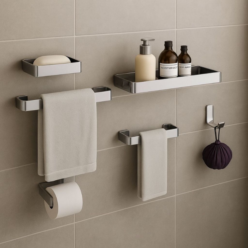 Kit Acessórios Para Banheiro 6 Peças Inox Alumínio Durável Cromado Lavabo Saboneteira Shampoo Toalha