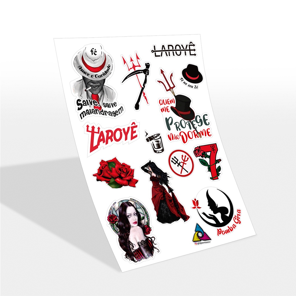 Cartela Stikers Adesivo Umbanda Candonblé Esquerda Pomba Gira Exú Mojubá Laroyê Seu Zé Pilintra Padilha Sete Saias Caveira Tranca Ruas Morcego Veludo