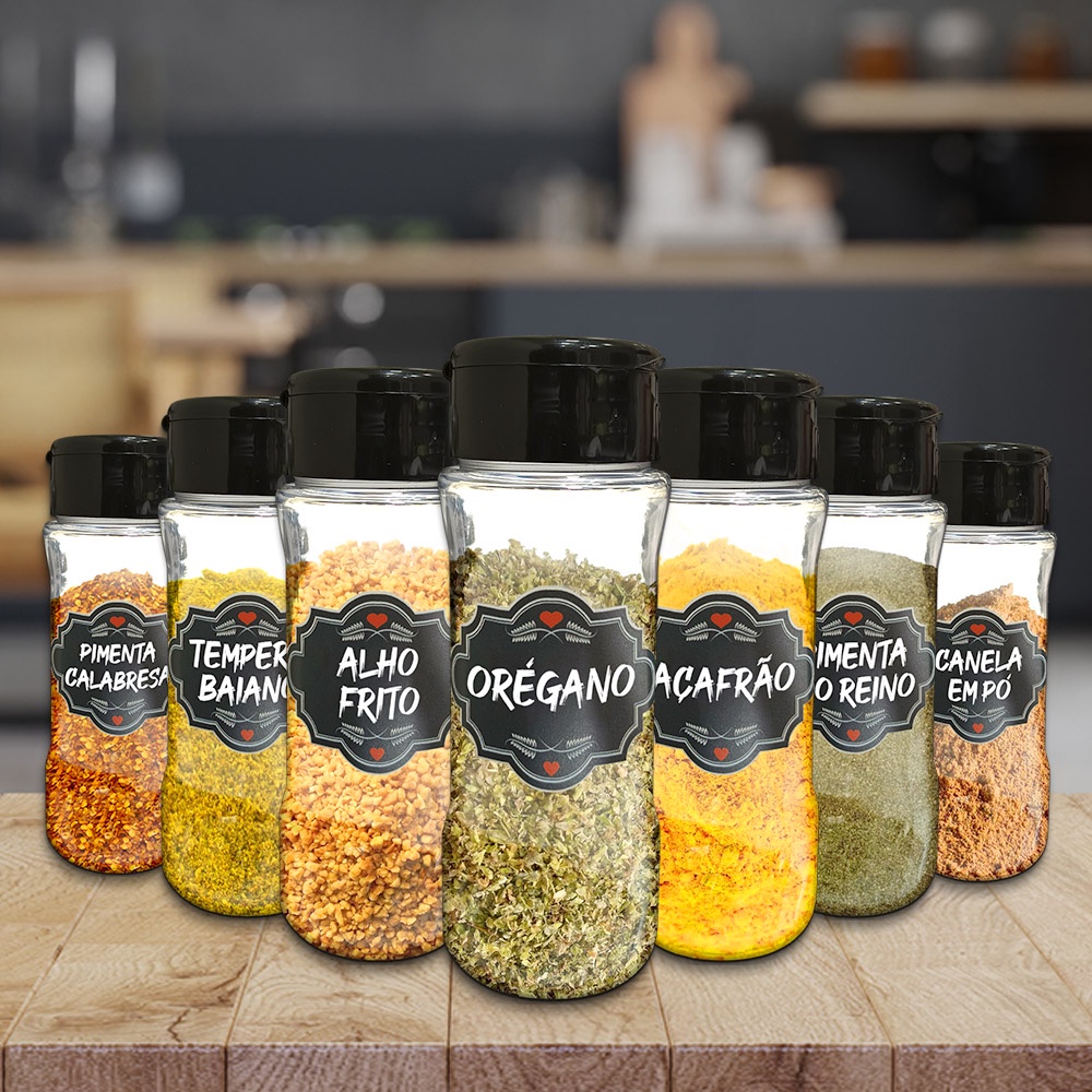 Kit 22 Potes para Tempero + Etiquetas Lousa e Caneta Giz Qualidade Premium com Tampa Dosadora Dupla