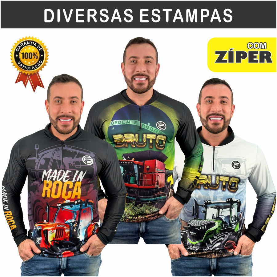KIT 3 Peças Camisa Camiseta Agro c/ Zíper Masculino UV Brasil Agropecuária Bruto Trator Blusa Proteção UV - Oficina Fishing