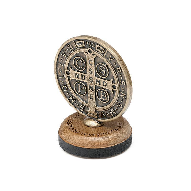 Adorno de Mesa Imagem da Medalha de São Bento de Metal e Pedestal em Madeira 6,2cm