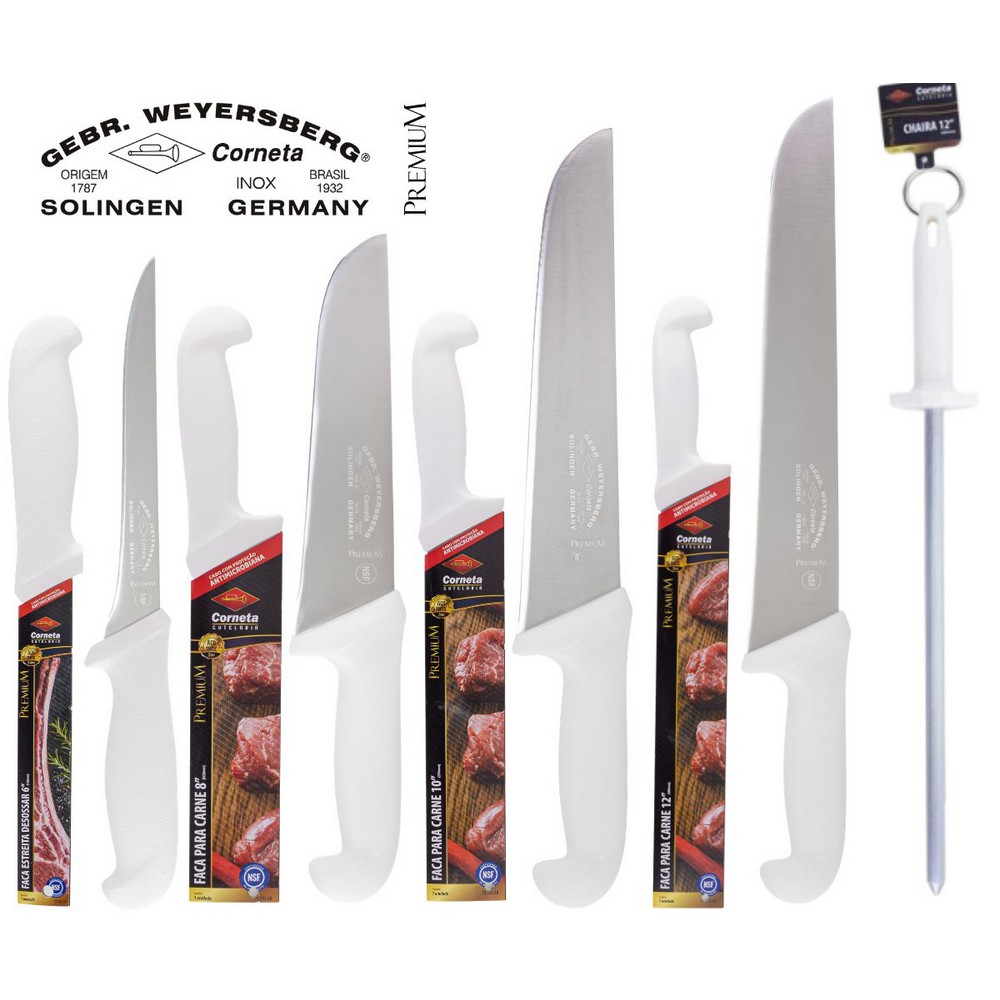 Kit 4 Facas Carne Açougueiro + Chaira 12" Com Protecao Antimicrobiana Corneta Premium