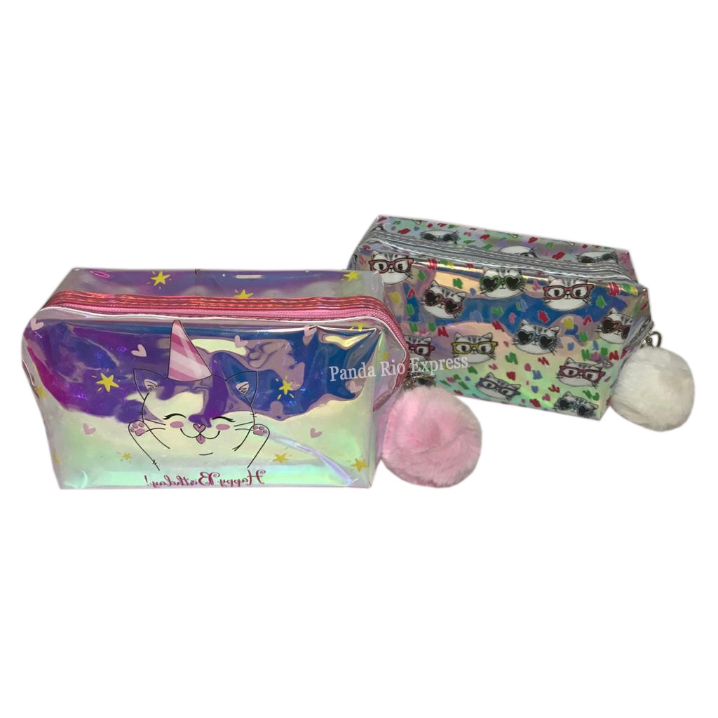 Necessaire Estojo Holográfica Organizadora Multiuso Com Chaveiro Pompom Feminina