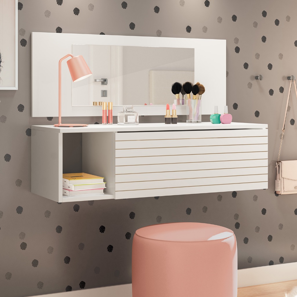Penteadeira Suspensa e Escrivaninha Joy Para Maquiagem E Decoração Com Espelho 1 Gaveta