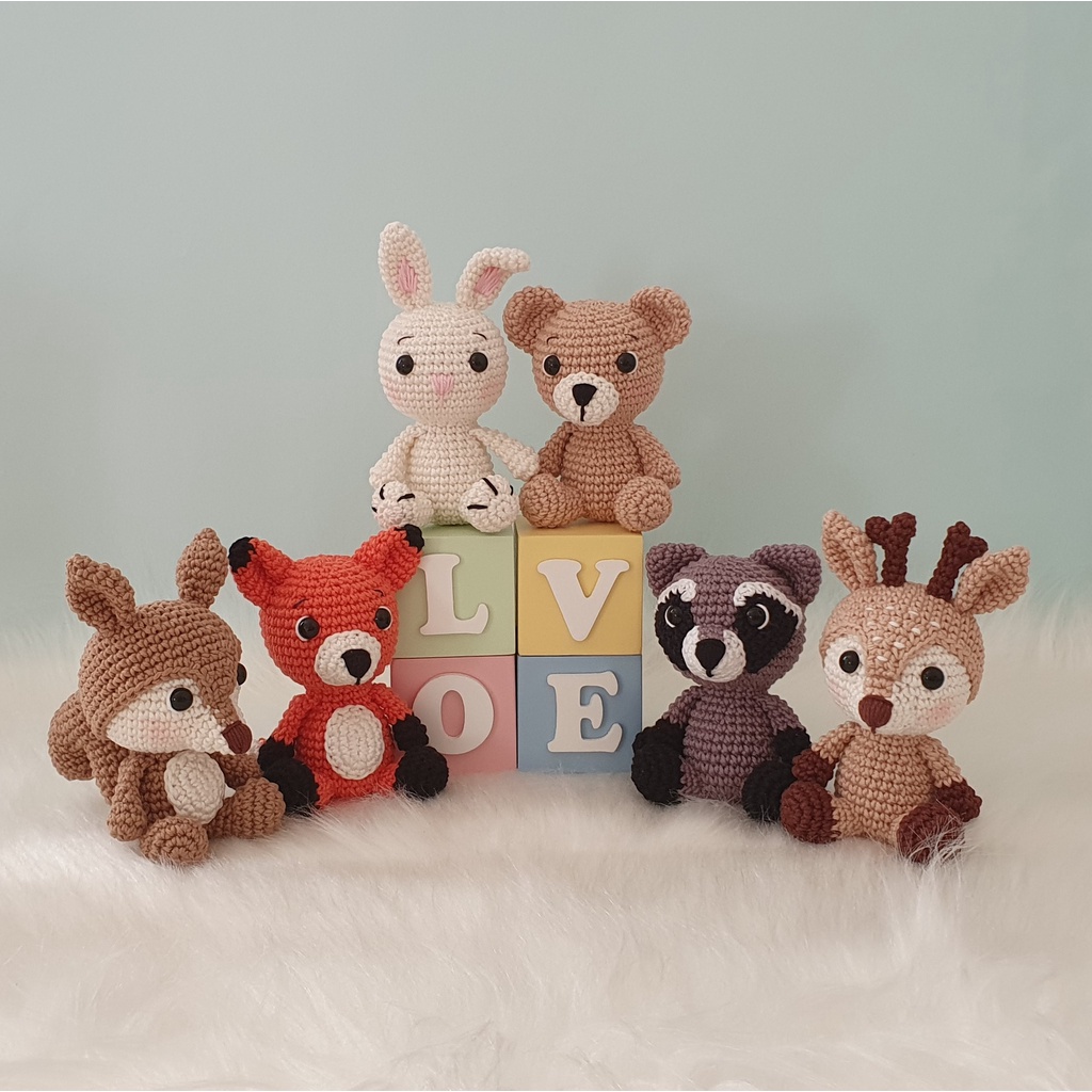 Bichinho Bosque Amigurumi (Cada) - Crochê - Decoração Amigurumis Coelho Urso Guaxinim Raposa Esquilo Cervo