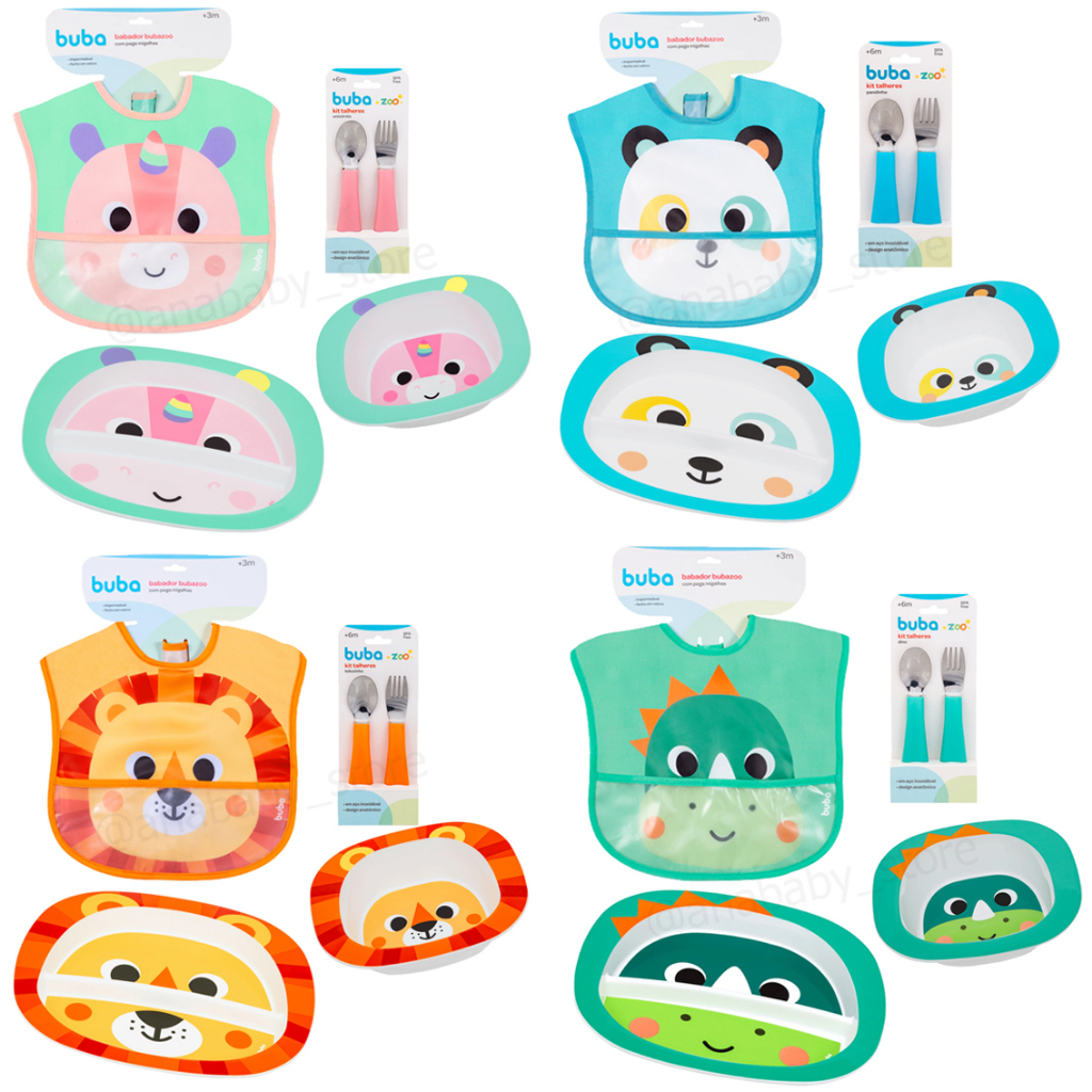 Kit alimentação bebê silicone com ventosa BUBA introdução alimentar refeição infantil prato babador pega migalhas colher garfo original