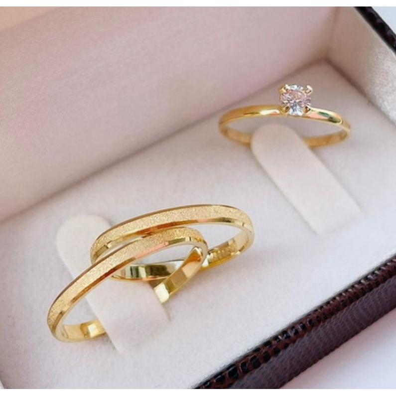 Aliança de Casamento 4mm Diamantada Chanfrada + Anel Solitário Zircônia Par de Alianças Jateada Noivado Banhada Aço Inoxidável 316L Cor Ouro 18k