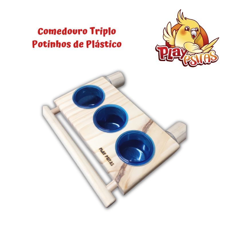 Comedouro Triplo. Ideal para calopsitas, agapornis, aves de pequeno porte. Potinhos de plástico.