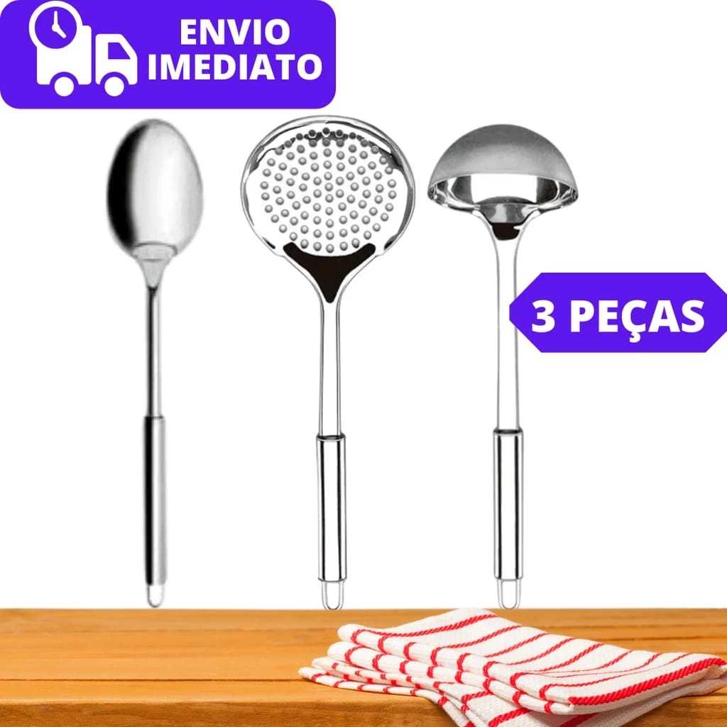 Envio Imediato ATENÇÃO KIT COM 3 PEÇAS CONTENDO: Concha 32,8cm. Escumadeira 32cm. Colher de servir 25,8cm. Material: Aço inox