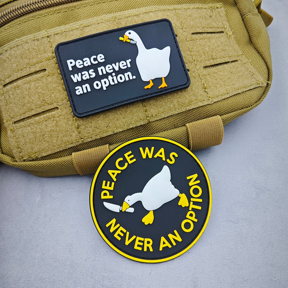 Remendo de borracha de PVC grande ganso tridimensional Velcro emblema paz nunca era uma opção com gancho braçadeira saco