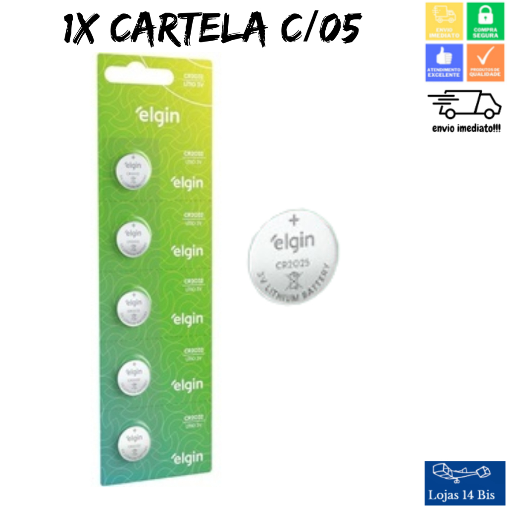 Cartela Bateria com 5 Moeda Cr2025 3v Pilha Elgin Original