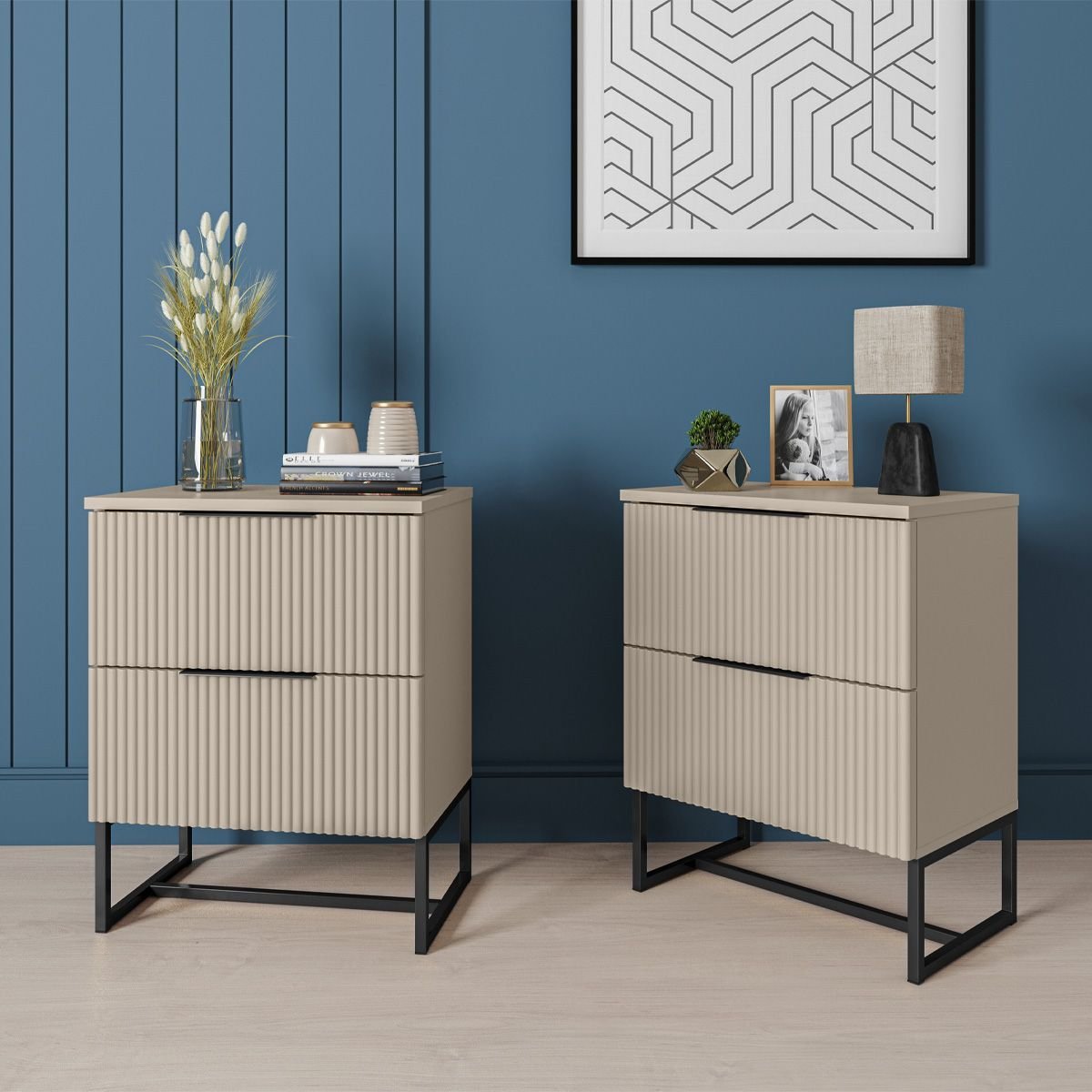 Kit 2 Mesas de Cabeceira Lumia Detalhe Ripado Base de Aço Industrial 2 Gavetas - Off White/pé Preto