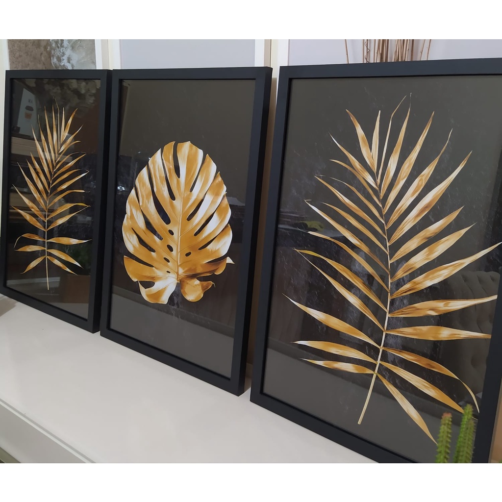 Kit 3 Quadros Moldura Caixa E Vidro Folhagens Dourada Flores Costela De Adão