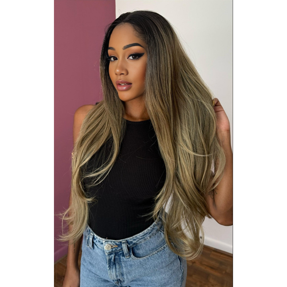 Peruca Front Lace Repartição Livre 13x4 - Fibra Proteína Colágeno, Cor ( Castanho Claro com Mechas ) + Brinde Escova